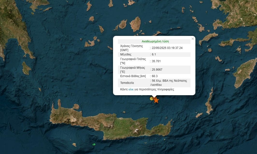 Μεγάλη διάρκεια και ένταση είχε ο σημερινός (22/05) σεισμός, μεγέθους 6,1 Ρίχτερ, ανοιχτά της Νεάπολης Λασιθίου, που έγινε