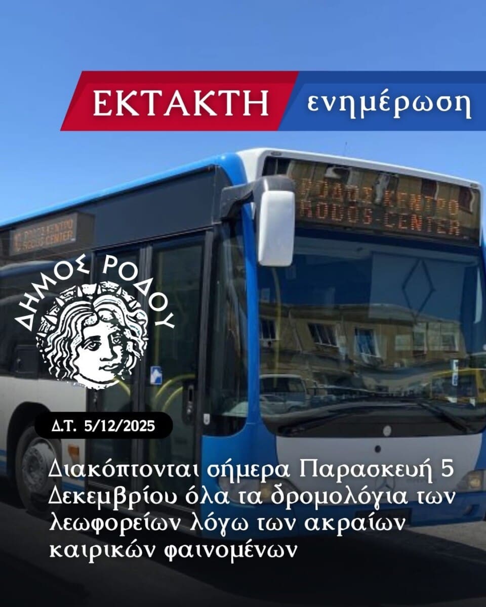 Σας ενημερώνουμε ότι, σύμφωνα με το έκτακτο δελτίο επικίνδυνων καιρικών φαινομένων της Εθνικής Μετεωρολογικής Υπηρεσίας, και για λόγους ασφαλείας