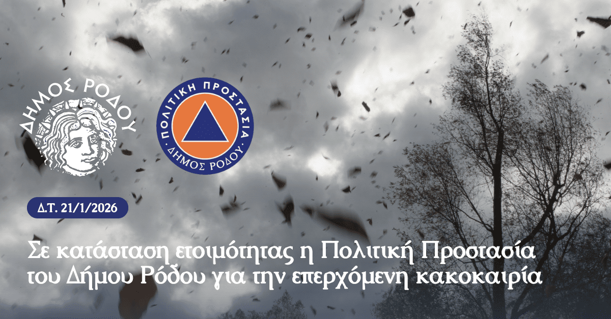 Ο Δήμος Ρόδου, σε συνέχεια του Έκτακτου Δελτίου Επικίνδυνων Καιρικών Φαινομένων που εξέδωσε η Εθνική Μετεωρολογική Υπηρεσία