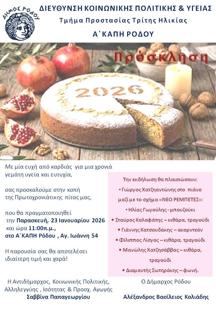 Το ΚΑΠΗ Δήμου Ρόδου, θα πραγματοποιήσει την κοπή της Πρωτοχρονιάτικης του πίτας την Παρασκευή 23 Ιανουαρίου 2026