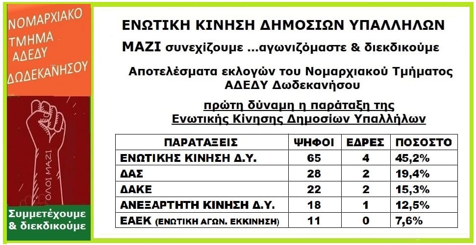 Αποτελέσματα εκλογών για το Νομαρχιακό Τμήμα ΑΔΕΔΥ Δωδεκανήσου