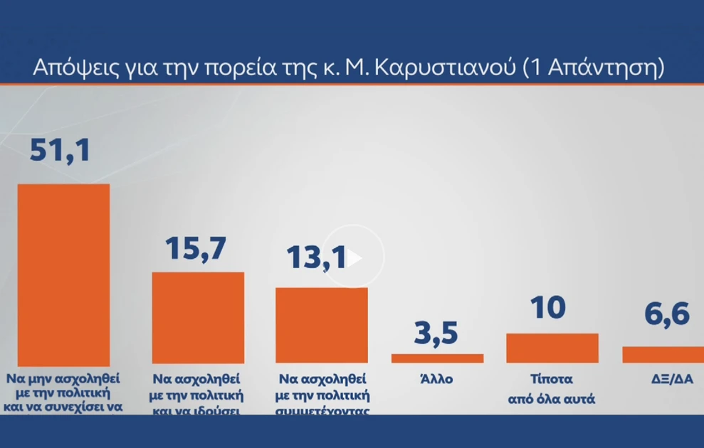 Το 51,1% πιστεύει ότι η Μαρία Καρυστιανού πρέπει να μην ασχοληθεί με τη πολιτική και να συνεχίσει να αγωνίζεται, ώστε να βρει δικαίωση για το νεκρό παιδί της.