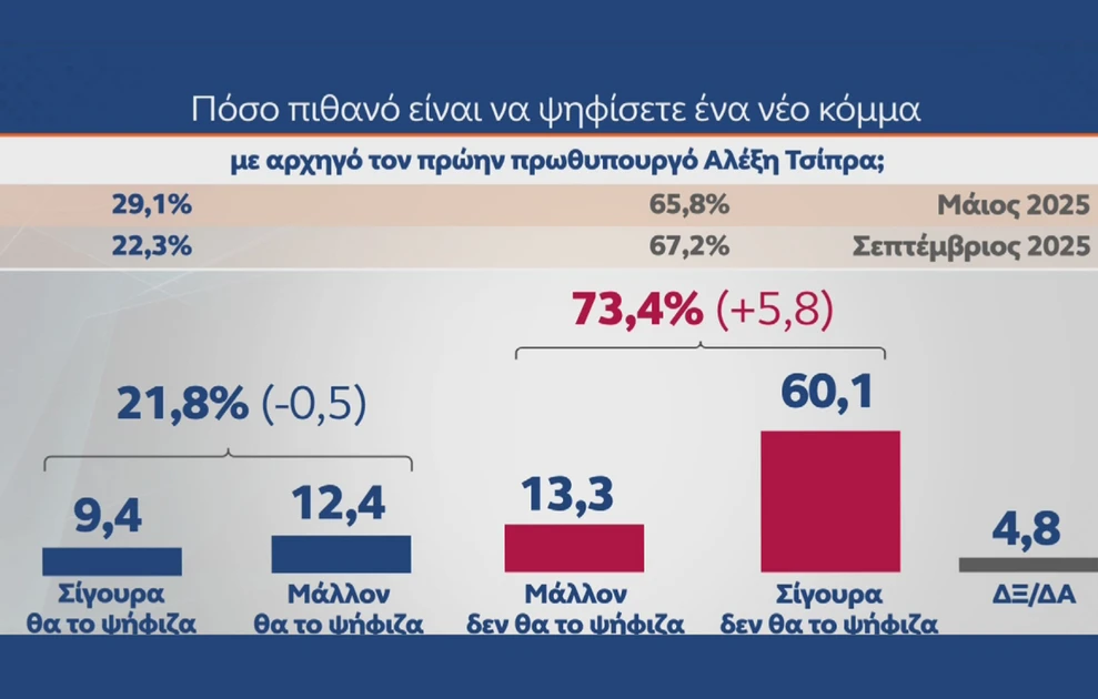 Το 21,8% θα ψήφιζε ένα νέο κόμμα Τσίπρα σε αντίθεση με το 73,4% που δεν θα στηρίξει με τη ψήφο του.