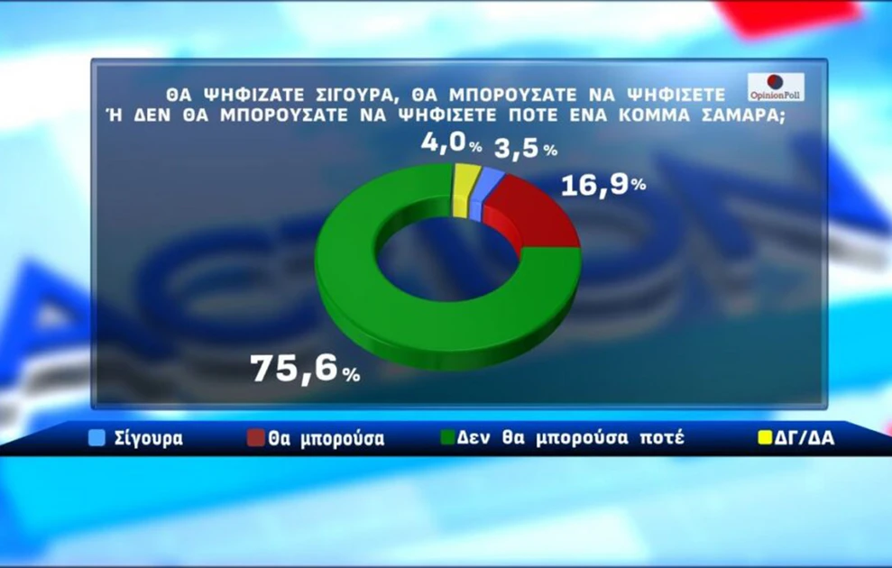 Στη δημιουργία κόμματος από τον Αντώνη Σαμαρά, το 3,5% θα ψήφιζε σίγουρα, το 16,9% θα μπορούσε, ενώ το 75,6% δεν θα ψήφιζε ποτέ.