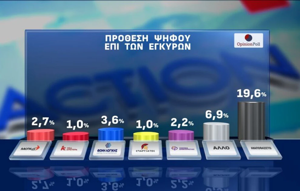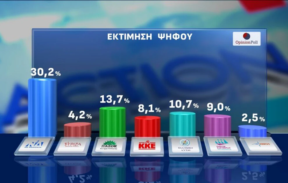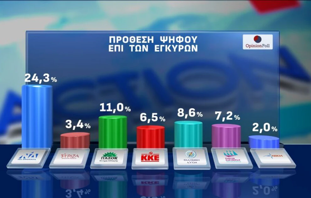 Η Opinion Poll πραγματοποίησε δημοσκόπηση για το Action24, με τις απαντήσεις να δείχνουν ότι η Νέα Δημοκρατία συνεχίζει να είναι πρώτο κόμμα και με μεγάλη διαφορά από το δεύτερο ΠΑΣΟΚ.
