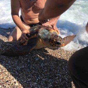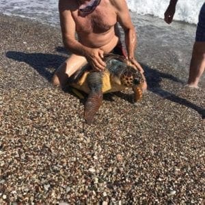 Μια χελώνα καρέτα – καρέτα βγήκε σήμερα το πρωι στην παραλία Έλλη της Ρόδου . Η χελώνα εντοπιστηκε γρήγορα απο λουόμενους που εσπευσαν να την δουν και διαπίστωσαν πως ήταν μπλεγμένη με πετονιές απο παραγάδι , ενώ ένα αγκίστρι ήταν καρφωμένο στο πτερύγιο της .