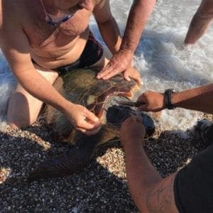 Αμέσως λουόμενοι εσπευσαν να βοηθήσουν την χελώνα και να την απελευθερώσουν απο τις πετονιές και το αγκίστρι . Μόλις σιγουρεύτηκαν οτι η χελώνα είναι καλά στην υγεία της , την άφησαν να επιστρέψει στην θάλασσα .