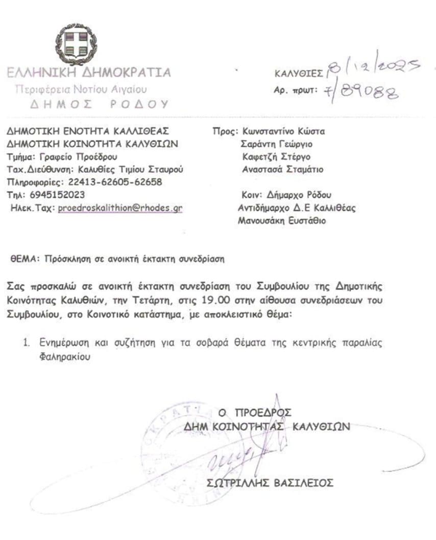 Ο Πρόεδρος της κοινότητας καλεί τους πολίτες σε ανοικτή έκτακτη συνεδρίαση με θέμα την επιχειρούμενη αλλοίωση της κεντρικής παραλίας Φαληρακίου.