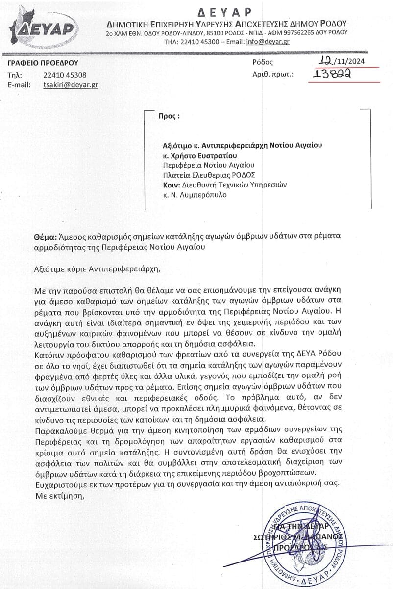 Έγγραφο-βόμβα παρουσίασε στο Δημοτικό Συμβούλιο ο πρόεδρος της ΔΕΥΑΡ, το οποίο είχε αποστείλει στην Περιφέρεια Νοτίου Αιγαίου στις 12 Νοεμβρίου 2024 — μόλις 18 ημέρες πριν την καταστροφική πλημμύρα. Στο έγγραφο αυτό, προειδοποιούσε ότι τα ρέματα της περιοχής ήταν ακαθάριστα και υπήρχε σοβαρός κίνδυνος πλημμυρικών φαινομένων.