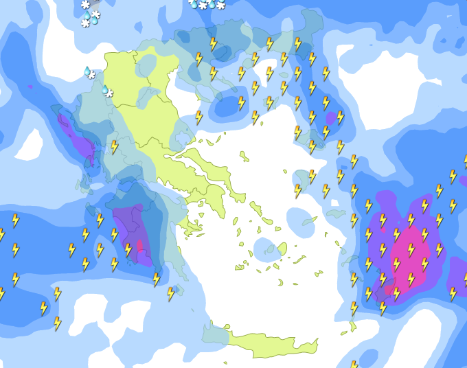 Θα πρέπει να περιμένουμε υψηλά ποσά υετού και ραγδαιότητας με τα φαινόμενα να συνοδεύονται απο ισχυρά αστραπόβροντα και δεν αποκλείουμε την πιθανότητα χαλαζοπτώσεων.