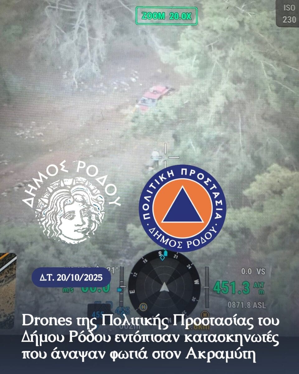Έπειτα από πληροφορίες, εντοπίστηκαν μέσω drone του Αυτοτελούς Γραφείου Πολιτικής Προστασίας δύο αλλοδαποί τουρίστες, οι οποίοι είχαν στήσει σκηνή στην κορυφή του Ακραμύτη και είχαν ανάψει φωτιά για μαγείρεμα — σε σημείο με πυκνή βλάστηση και καύσιμη ύλη, ενώ η αντιπυρική περίοδος παραμένει σε ισχύ. Η εστία εντοπίστηκε εγκαίρως και κατασβέστηκε άμεσα, αποτρέποντας μια εξαιρετικά επικίνδυνη εξέλιξη.