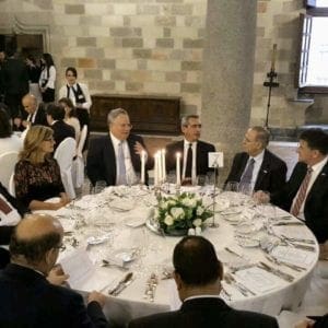 Στο επίσημο δείπνο που παρέθεσε ο Περιφερειάρχης, παρακάθισαν ο Έλληνας Υπουργός Εξωτερικών κ. Νίκος Κοτζιάς, o Υπουργός Εξωτερικών της Κύπρου κ. Ιωάννης Κασουλίδης, ο Υπουργός Εξωτερικών της Αιγύπτου κ. Sameh Hassan Shoukry, η Υπουργός Εξωτερικών της Βουλγαρίας κα Ekaterina Zaharieva, ο Υπουργός Εξωτερικών της Λιβύης κ. Mohamed Taher Siala, o Υπουργός Εξωτερικών και Ευρωπαϊκών Υποθέσεων της Σλοβακίας κ. Miroslav Lajcak, η Υφυπουργός Εξωτερικών της Αλβανίας κα Odeta Barbullushi, ο βοηθός Υπουργός Εξωτερικών των Ηνωμένων Αραβικών Εμιράτων για θέματα πολιτικών υποθέσεων κ. Ahmed Abdul Rahman Al Jarman, o Γενικός Γραμματέας του Υπουργείου Εξωτερικών και Μετανάστευσης του Λιβάνου κ. Charbel Wehbi, ο Γραμματέας του Υπουργείου Εξωτερικών της Τυνησίας κ. Sabri Bachtobji, οι Πρέσβεις της Αιγύπτου κ. Ehab Nasr, της Αλβανίας κα Ardiana Hobdari, της Αλγερίας Dr Noureddine Bardad-Daidj, της Βουλγαρίας κα Emilia Kraleva, των Ηνωμένων Αραβικών Εμιράτων κ. Sultan Mohammed Majed Alali, της Ιταλίας κ. Efisio Luigi Marras, του Κατάρ κ. Abdulaziz Ali A.N. Al-Naama, του Κουβέιτ κ. Saud Faisal Saud Aldaweesh, του Ομάν κ. Sheikh Ahmed bin Salim Al-Shanfari, της Ρουμανίας κ. Stefan Tinca, της Σαουδικής Αραβίας κ. Essam Baitalmal , της Σλοβακίας κ. Peter Michalko, της Τυνησίας κ. Lassaad M’hirssi, ο πρέσβης κ. Khalil Ibrahim Al-Thawadi, βοηθός Γενικού Γραμματέα της Ένωσης Αραβικών Κρατών και ο Dr Abdulaziz bin Hamad Al-Awaisheg, Αναπληρωτής Γενικός Γραμματέας Πολιτικών Υποθέσεων και Διαπραγματεύσεων στο Συμβούλιο Συνεργασίας του Κόλπου (Gulf Cooperation Council).