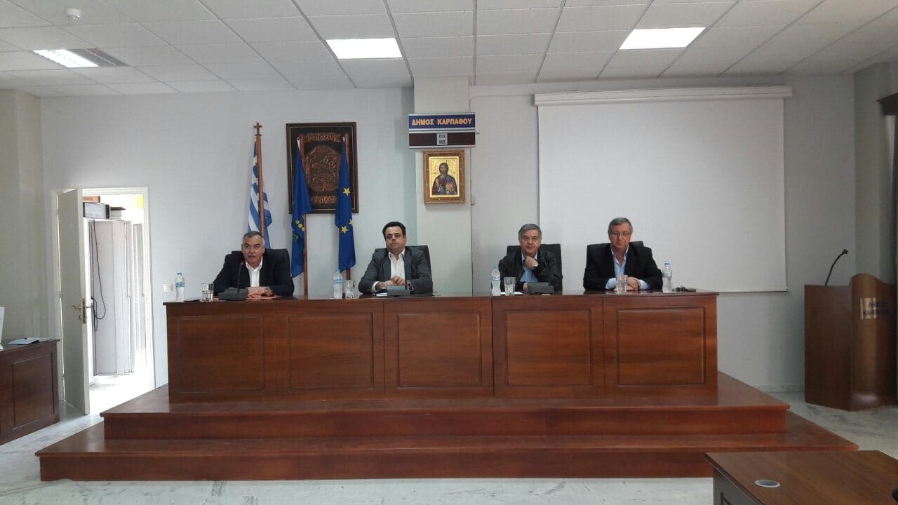 Κατά την επίσκεψή του στο νησί της Καρπάθου, είχε την ευκαιρία να συναντηθεί με τον Δήμαρχο, τον Έπαρχο και το Δημοτικό Συμβούλιο, όπου συζητήθηκαν ζητήματα που αφορούν την ακτοπλοΐα και τις αλλαγές που προωθούνται από πλευράς Υπουργείου Ναυτιλίας με το σκοπό της απρόσκοπτης και αναβαθμισμένης σύνδεσης του νησιού από και προς την Ρόδο και την Κρήτη.