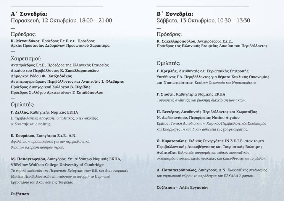 Στις 12 και 13 Οκτωβρίου 2018 στην Αίθουσα Συνεδριακών Εκδηλώσεων του Δικηγορικού Συλλόγου θα πραγματοποιηθεί μία σημαντική Επιστημονική Διημερίδα με γενικό τίτλο «Περιβάλλον και Νησιωτικότητα», υπό την αιγίδα του Δικηγορικού Συλλόγου Ρόδου και της Ελληνικής Εταιρείας Δικαίου Περιβάλλοντος. Όπως γίνεται αντιληπτό, από το κεντρικό τίτλο του συνεδρίου, η θεματική ξεπερνά τα όρια του Δικαίου και είναι ανοιχτή προς το ευρύ κοινό. Η είσοδος θα είναι ελεύθερη για όλους ενδιαφερόμενους και ενεργούς πολίτες, δικαστικούς λειτουργούς δικηγόρους, μηχανικούς, επιχειρηματίες από το χώρο του Τουρισμού και δημοσίους υπαλλήλους ενώ αξιοσημείωτη είναι η ενεργός συμμετοχή, παρουσία και υποστήριξη φορέων, όπως ο Σύλλογος Αρχιτεκτόνων Δωδεκανήσου και ο Σύνδεσμος Ελληνικών Τουριστικών Επιχειρήσεων, εκπροσωπώντας τις τεχνικές-πρακτικές και αναπτυξιακές-επενδυτικές διαστάσεις αντίστοιχα. Παρέμβαση στην εκδήλωση θα πραγματοποιήσει το Ινστιτούτο Αιγαίου του Δικαίου της Θάλασσας και του Ναυτικού Δικαίου, ενώ έχουν δεχθεί επίσημη πρόσκληση για να παρευρεθούν και να θέσουν τους δικούς τους προβληματισμούς, ο Σύλλογος Προστασίας Περιβάλλοντος Ρόδου και το Αντιπυρηνικό Παρατηρητήριο Μεσογείου.