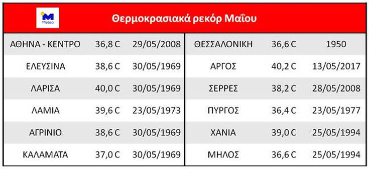 Από τον πίνακα του Εθνικού Αστεροσκοπείου Αθηνών/meteo.gr που ακολουθεί και συνοψίζει τις υψηλότερες μέγιστες που έχουν καταγραφεί σε επιλεγμένες περιοχές, προκύπτει ότι η υψηλότερη θερμοκρασία τον Μάιο σημειώθηκε στο Άργος και ήταν ίση με 40,2 βαθμούς το 2017, ενώ ακολουθούν η Λάρισα με 40 το 1969 και η Λαμία με 39.6 το 1973.