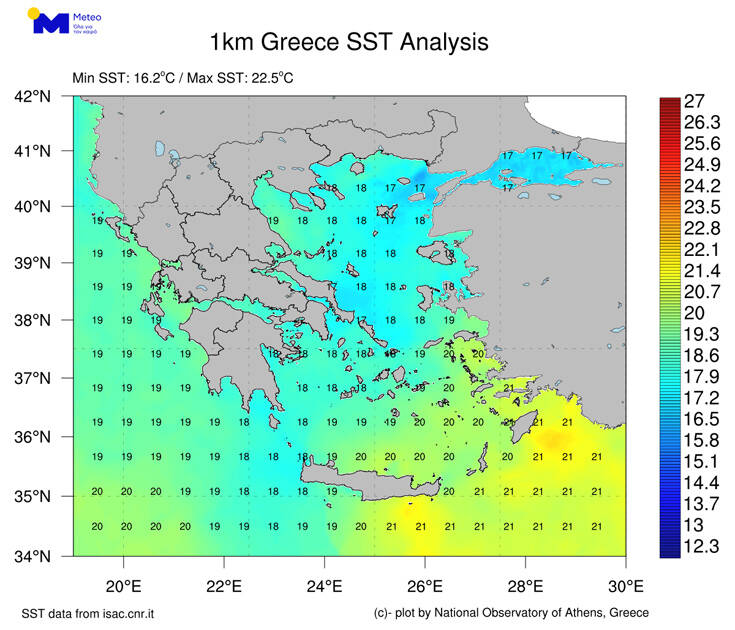 Οι θερμοκρασίες της θάλασσας θα είναι κοντά στις κανονικές για την εποχή τιμές και θα κυμαίνονται μεταξύ 18 και 21 βαθμών Κελσίου, με τις υψηλότερες τιμές να εντοπίζονται στο Νοτιοανατολικό Αιγαίο και τις χαμηλότερες στο Βόρειο Αιγαίο και στη Θάλασσα των Κυθήρων, όπως φαίνεται και στον χάρτη που ακολουθεί.