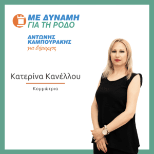 «Συμμετέχω στο συνδυασμό «Με Δύναμη Για τη Ρόδο», με τον Αντώνη Καμπουράκη, πιστεύοντας ότι είναι ο καλύτερος για το Δήμο της Ρόδου. Η αξία του και οι ικανότητές του είναι γνωστές και αποτελούν εχέγγυα για την προοπτική του νησιού μας.»