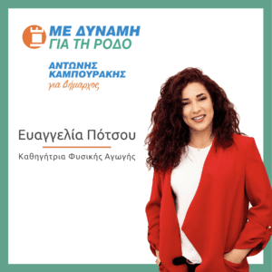 «Συμπορεύομαι με τον Αντώνη Καμπουράκη στο συνδυασμό «Με Δύναμη Για τη Ρόδο», ώστε όλοι μαζί να δουλέψουμε για να αποκτήσει το νησί μας την αίγλη και τη λάμψη που του αξίζει.»