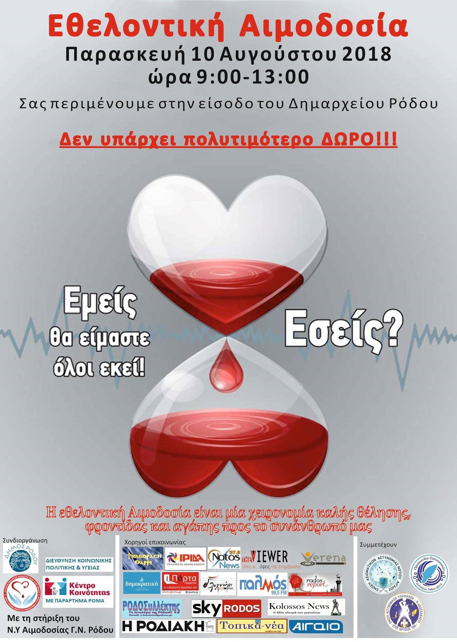 Στα πλαίσια της συνεργασίας του συλλόγου εθελοντών αιμοδοτών και του Δήμου Ρόδου θα διεξαχθεί την Παρασκευή 10 Αυγούστου 2018, από τις 9:00 έως τις 13:00 Εθελοντική Αιμοδοσία στην είσοδο του Δημαρχείου Ρόδου, με σκοπό την κάλυψη των αναγκών σε αίμα του νησιού. Αξίζει να σημειωθεί ότι κατά τους καλοκαιρινούς μήνες λόγω της αύξησης των τροχαίων ατυχημάτων οι ανάγκες σε αίμα διπλασιάζονται ενώ η προσφορά μειώνεται.