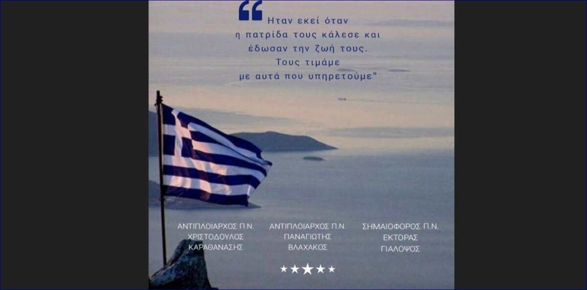 Tα ονόματα των τριών ηρώων: Αντιπλοίαρχος Π.Ν. Χριστόδουλος Καραθανάσης, Αντιπλοίαρχος Π.Ν. Παναγιώτης Βλαχάκος και Σημαιοφόρος Π.Ν. Έκτορας Γιαλοψός , σύμβολα καθήκοντος και αυταπάρνησης που παραμένουν ζωντανά στη συλλογική μνήμη.