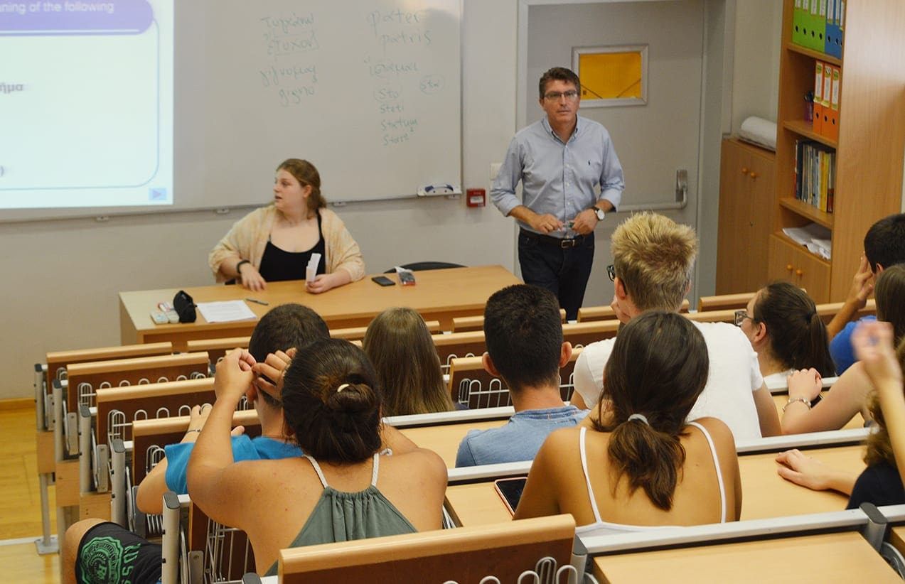 Η επίσκεψη των μαθητών εντάχθηκε στο πλαίσιο επιμορφωτικής εκδρομής-επιβράβευσης που πραγματοποιούν στο νησί μας αυτές τις ημέρες με τη συνοδεία του Προέδρου της Αυστρο-Ελληνικής Ένωσης κ. Αναστάσιου Στρίκου και της κ. Μαρίτσας Μαντικού. Οι νεαροί αυστριακοί μαθητές προσήλθαν το πρωί στα Εκπαιδευτήρια «ΡΟΔΙΩΝ ΠΑΙΔΕΙΑ» προκειμένου να εμπλουτίσουν την εκδρομή τους με εκπαιδευτικές εμπειρίες από το σχολείο. Το πρόγραμμά τους ξεκίνησε με το καλωσόρισμα του Γενικού Διευθυντή των Εκπαιδευτηρίων κ. Κυριάκου Κυριακούλη. Στη συνέχεια οι μαθητές συνάντησαν μαθητές της Α’ και Β΄Λυκείου του σχολείου και συμμετείχαν σε θεατρική δράση με την καθοδήγηση της εκπαιδευτικού θεάτρου κ. Μυρσίνης Λενούδια. Έπειτα, στο αμφιθέατρο των εκπαιδευτηρίων, παρακολούθησαν μάθημα Αρχαίας Ελληνικής Γλώσσας του τμήματος των ανθρωπιστικών σπουδών της Β΄ Λυκείου με τον φιλόλογο κ. Μιχάλη Ρούσο. Το μάθημα είχε διαμορφωθεί και εμπλουτιστεί με ποικίλες γλωσσικές δραστηριότητες και οι φιλοξενούμενοι μαθητές ενεπλάκησαν με ενθουσιασμό στην εκπαιδευτική διαδικασία. Οι μαθητές των εκπαιδευτηρίων είχαν την ευκαιρία να ακούσουν τους αυστριακούς συναδέλφους τους να διαβάζουν αρχαία κείμενα με ερασμιακή προφορά και να διαπιστώσουν διαφορές από τον δικό μας τρόπο ανάγνωσης.