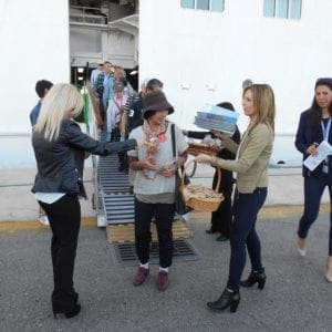 Τα στελέχη της Διεύθυνσης Τουρισμού κυρίες Σέβα Τσίμπλη και Αναστασία Σαββιού μοίρασαν έντυπο υλικό σε όσους επιθυμούσαν να εκδράμουν στο νησί της Ρόδου και απάντησαν πρόθυμα σε όλες τις ερωτήσεις που τους έθεσαν οι επιβάτες του κρουαζιερόπλοιου. Μάλιστα πολλοί από αυτούς ήθελαν να ενημερωθούν εκτενώς για το νησί μας.