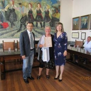 Η κυρία Kathleen και ο κύριος Edward Cafferty από τη Μεγάλη Βρετανία οι οποίοι φέτος επισκέφθηκαν τη Ρόδο για 10η φορά και διέμεναν στο ξενοδοχείο «Alkmini» στο Θεολόγο. Το ζευγάρι συνόδευσε στο Δημαρχείο ο ιδιοκτήτης του ξενοδοχείου «Alkmini» κύριος Μιχάλης Μουρσελάς.