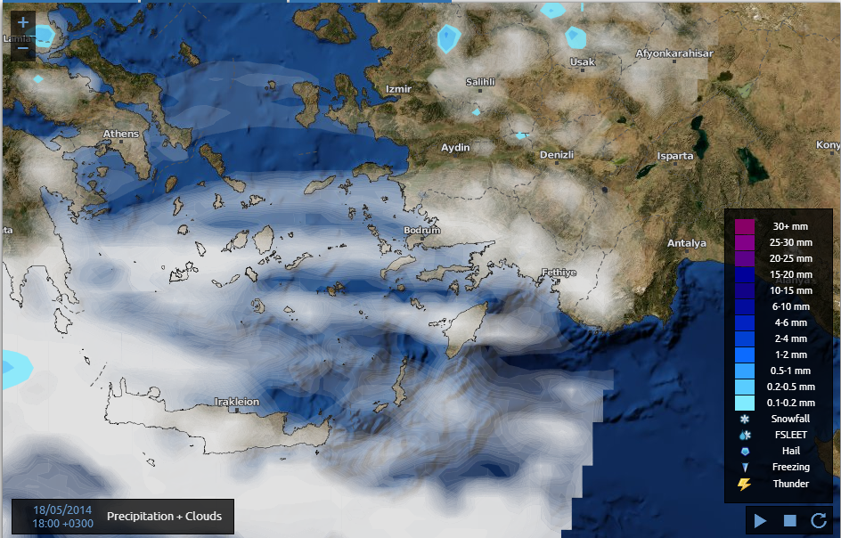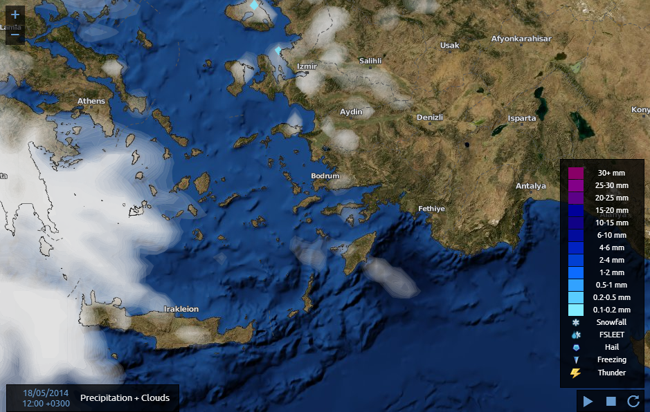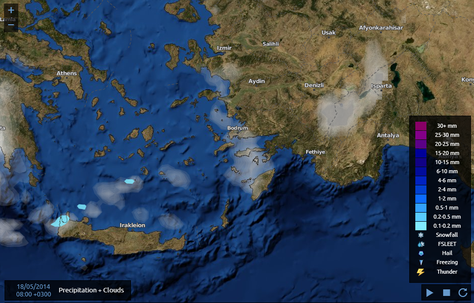 Αραιές νεφώσεις στης 08:00 το πρωί απο το ύψος της Ρόδου μέχρι την Κώ.