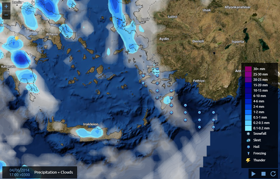 Λίγο πριν το βραδακι στης 19:00 η βροχή θα επηρεάζει την Ρόδο από τα κεντρικά τμήματα μέχρι την πόλη.