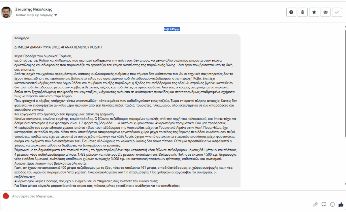 Ένας «συμπολίτης» μας εμφανίστηκε με μια καταγγελία στο Rodosrepoort θέλοντας, όπως έγραφε, να διαμαρτυρηθεί για τον πεζόδρομο στο παραλιακό μέτωπο.