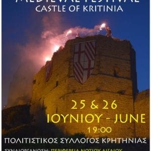 Με φόντο το επιβλητικό Κάστρο της Κρητηνίας θα βιώσουμε όλοι μαζί δυο αξέχαστες μεσαιωνικές βραδιές. Μαζί θα ταξιδέψουμε στο χρόνο και θα μεταφερθούμε σε άλλες εποχές. Σε ένα μοναδικά διαμορφωμένο χώρο θα σας παρουσιάσουμε ένα πλούσιο πρόγραμμα με γυναίκες να αναπαριστάνουν τις ασχολίες της καθημερινής ζωής και μάγειρες να ετοιμάζουν σε μεγάλες φωτιές διάφορα εδέσματα της εποχής. Κάτω από μελωδικά ακούσματα θα θαυμάσουμε μεσαιωνικούς χορούς , ξυλοπόδαρους και ζογκλέρ με φωτιές.