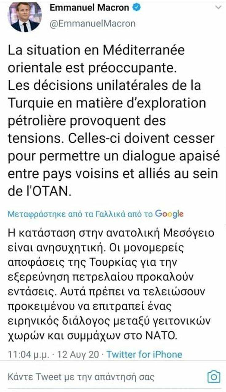 Η Γαλλία θα ενισχύσει προσωρινά τη στρατιωτική παρουσία της στη Μεσόγειο για να δείξει ότι το διεθνές δίκαιο πρέπει να γίνεται σεβαστό, τόνισε ο κ. Μακρόν και πρόσθεσε ότι θα αυξηθεί η στρατιωτική παρουσία της στη Μεσόγειο, σε συνεργασία με άλλους εταίρους της Ευρωπαϊκής Ένωσης, συμπεριλαμβανομένης της Ελλάδας.