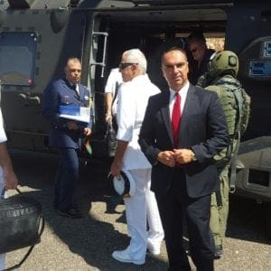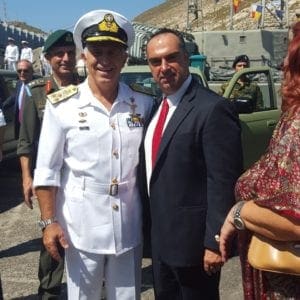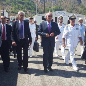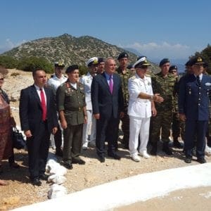 Ο κ. Φλεβάρης συνεχάρει τον Αρχηγό ΓΕΕΘΑ για την παρουσία των αγημάτων. Στη συνέχεια μετέβησαν στην πλωτή μονάδα του στόλου και μετά με ελικόπτερο του Ελληνικού Στρατού στα νησιά του συμπλέγματος της Μεγίστης. Πολύ συγκινητική ήταν η επίσκεψη στο νοτιότατο άκρο της Ευρώπης, τη νησίδα Στρογγυλή όπου ο Υπουργός εντυπωσιάστηκε από την άριστη εικόνα και το φρόνημα της φρουράς. Ξεχωριστή ήταν η επίσκεψη στη νήσο Ρω και στο μνήμα της μεγάλης Ελληνίδας και συμπατριώτισσας μας Δέσποινας Αχλαδιώτη, της «Κυράς της Ρω» η οποία επί μισό αιώνα σχεδόν ύψωνε στη νησίδα την Γαλανόλευκη, ακόμα και κατά την Ιταλική κατοχή. Ο κ. Φλεβάρης από τη νησίδα Ρω όπου η Περιφέρεια Νοτίου Αιγαίου είχε εντάξει το έργο Αποκατάστασης – Διαμόρφωσης του Αρχαίου Οχυρού Ρω, μετέφερε από το κάστρο το μήνυμα του Περιφερειάρχη κ. Γιώργου Χατζημάρκου. «Θα διεκδικούμε με σθένος για κάθε νησί και κάθε βράχο Ελληνικής γης που βρίσκεται στο Νότιο Αιγαίο, όσα το πάθος και η αγάπη μας για την Πατρίδα επιβάλλει».