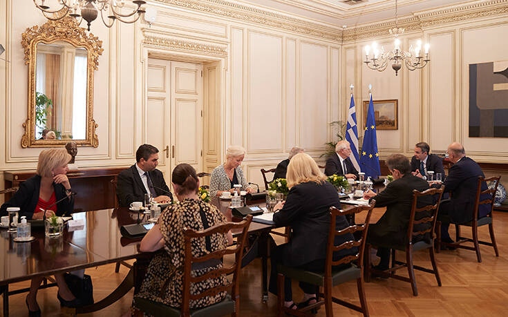 Κυριάκος Μητσοτάκης: Χαίρομαι ιδιαιτέρως που σας υποδέχομαι στην Ελλάδα και στο πρωθυπουργικό γραφείο, και είμαι ικανοποιημένος που είχατε την ευκαιρία να επισκεφτείτε σήμερα το πρωί τον Έβρο, τα σύνορα μεταξύ Ελλάδας και Τουρκίας, μεταξύ Ευρωπαϊκής Ένωσης και Τουρκίας.