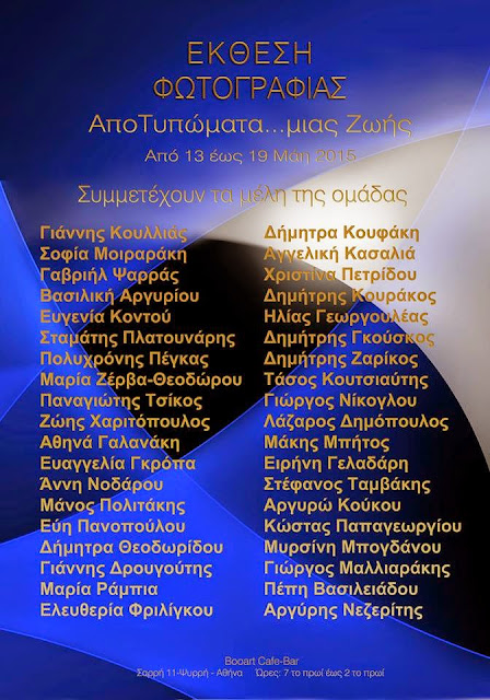 Η έκθεση διοργανώνεται από την φωτογραφική ομάδα “ΑποΤυπώματα μιας ζωής “ στον χώρο του BOO CAFE BAR στην περιοχή Ψυρή (Σαρρή 21). Συμμετέχουν 38 καλλιτέχνες με τα έργα τους και ανάμεσά τους ο δικός μας Γιάννης Κουλλιάς, ο συνεπής “θεράπων του Ασκληπιού” και μια πολυδιάστατη καλλιτεχνική μορφή της Καλύμνου.