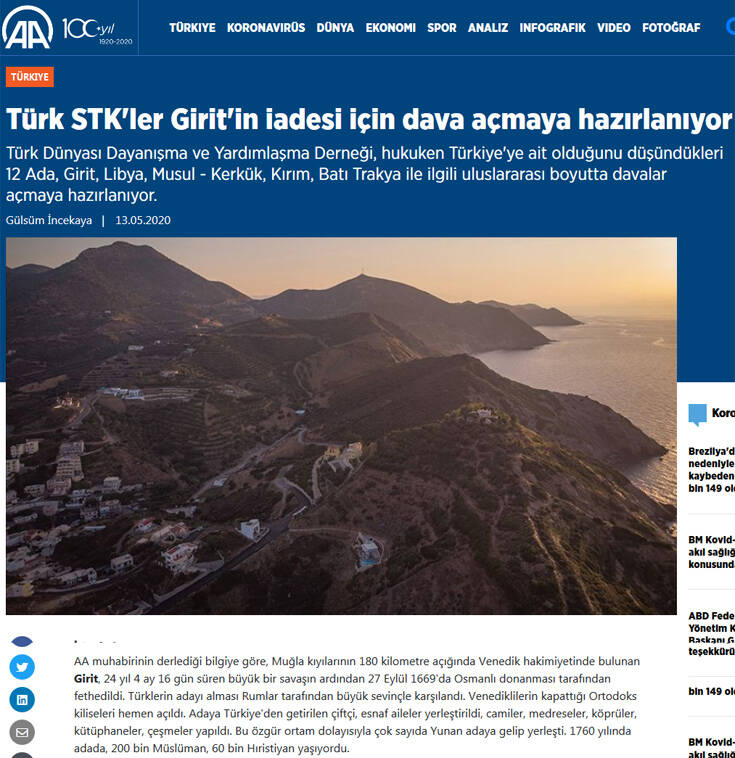 Το νησί πέρασε σε ελληνική κυριαρχία το 1909, συνεχίζει το Anadolu, σημειώνοντας πως με το δόγμα της «Γαλάζιας Πατρίδας», το νομικό καθεστώς της Κρήτης και των νησιών του Αιγαίου επανήλθε στην ατζέντα.