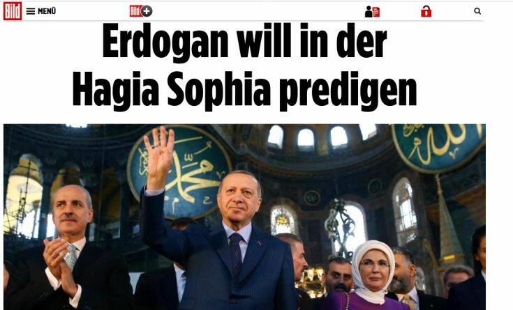 «Όχι απλά γυρίζει την πλάτη στις διεθνείς επικρίσεις για την απόφασή του να μετατρέψει από μουσείο σε τζαμί την Αγιά Σοφιά. Όχι μόνο απλά θέλει να προσευχηθεί στις 24 Ιουλίου όταν θα ανοίξει για πρώτη φορά ως τζαμί στο κοινό, αλλά σχεδιάζει να κάνει κήρυγμα», αποκαλύπτει δημοσίευμα της γερμανικής εφημερίδας.