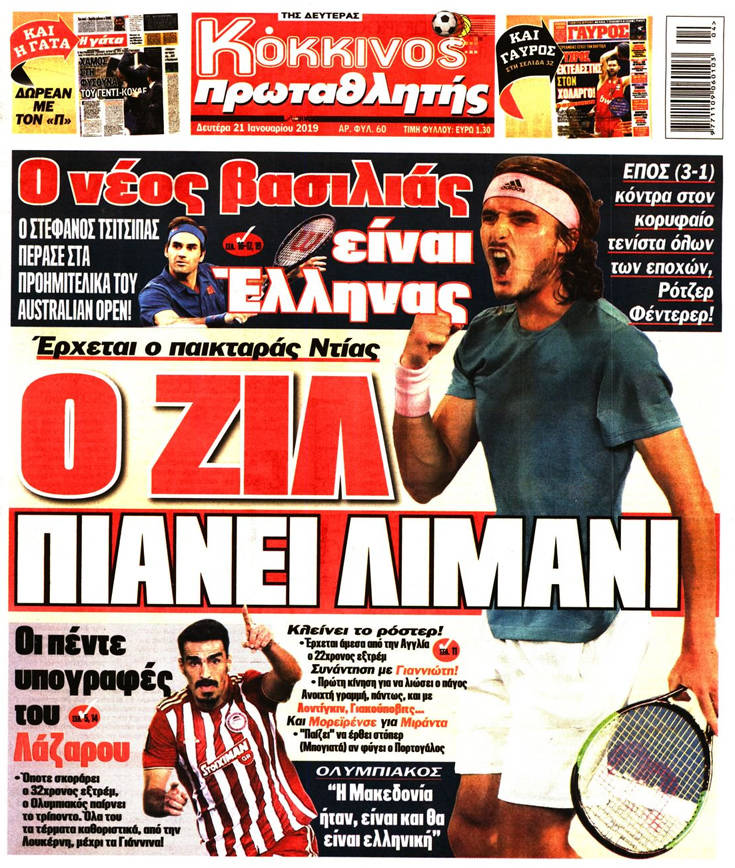 «Ο νέος βασιλιάς είναι Έλληνας» γράφει στο πρωτοσέλιδό του ο «Κόκκινος πρωταθλητής», κάνοντας λόγο για «έπος» του Τσιτσιπά κόντρα στον κορυφαίο τενίστα όλων των εποχών.