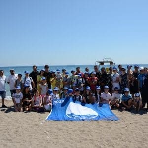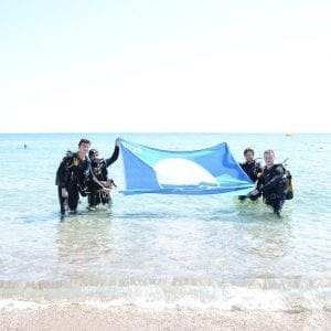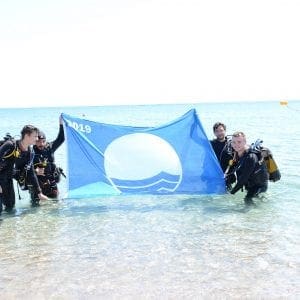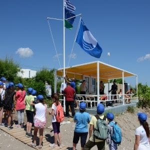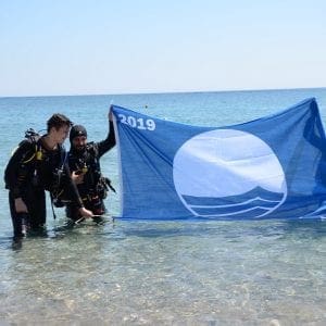 Ακολούθησε η έπαρση της Γαλάζιας Σημαίας να θυμίζει συμβολικά τόσο τη δράση, όσον και το καθήκον του καθενός για ένα καλύτερο και καθαρότερο περιβάλλον στην Μεσόγειο. Η “Γαλάζια Σημαία” είναι ένα παγκόσμιο (πάνω από 50 χώρες σε όλο τον πλανήτη) σύμβολο ποιότητας, το οποίο απονέμεται με αυστηρά κριτήρια σε οργανωμένες ακτές που πληρούν τα σχετικά κριτήρια.