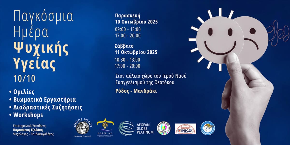 Με αφορμή την Παγκόσμια Ημέρα Ψυχικής Υγείας που γιορτάζεται κάθε χρόνο στις 10 Οκτωβρίου, ο Δήμος Ρόδου και οι συνεργαζόμενοι φορείς διοργανώνουν ένα πλούσιο πρόγραμμα εκδηλώσεων αφιερωμένο στην ψυχική υγεία.