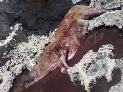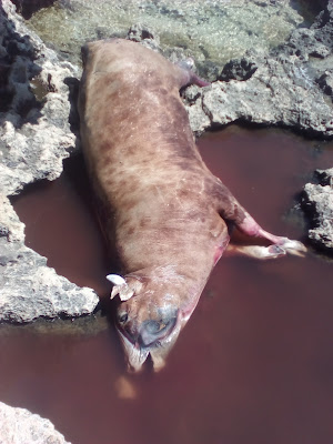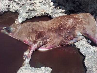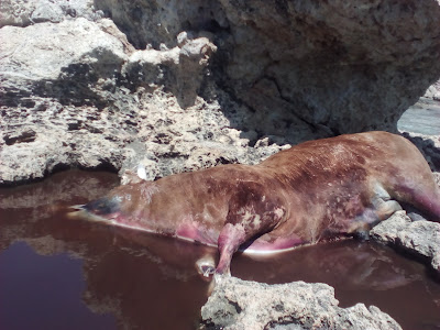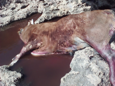 Ένας μεγαλόσωμος Ταύρος πεταμένος στα βράχια που μάλλον θα ταξίδευε για μέρες ξεβράστηκε στην περιοχή, την δυσοσμία από το ζώο την αισθάνεσαι από εκατοντάδες μέτρα!