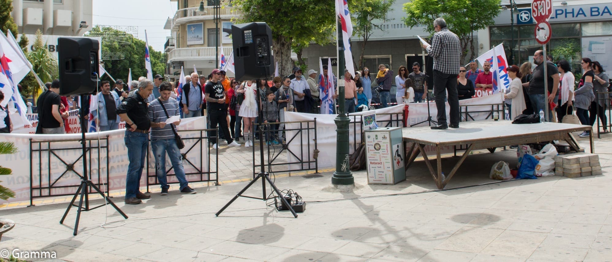 Από νωρίς το πρωί η εξέδρα και οι σημαίες και τα πανό ήταν στημένα στο χώρο ενώ εργατικά τραγούδια ακούγονταν από τη μικροφωνική. Λίγο πριν τις 11 άρχισε να φτάνουν οι εργαζόμενοι. Αρκετοί τουρίστες, ορισμένοι μάλιστα από τη γειτονική Τουρκία, σταματούσαν και φωτογραφίζονταν με τις σημαίες του ΠΑΜΕ.