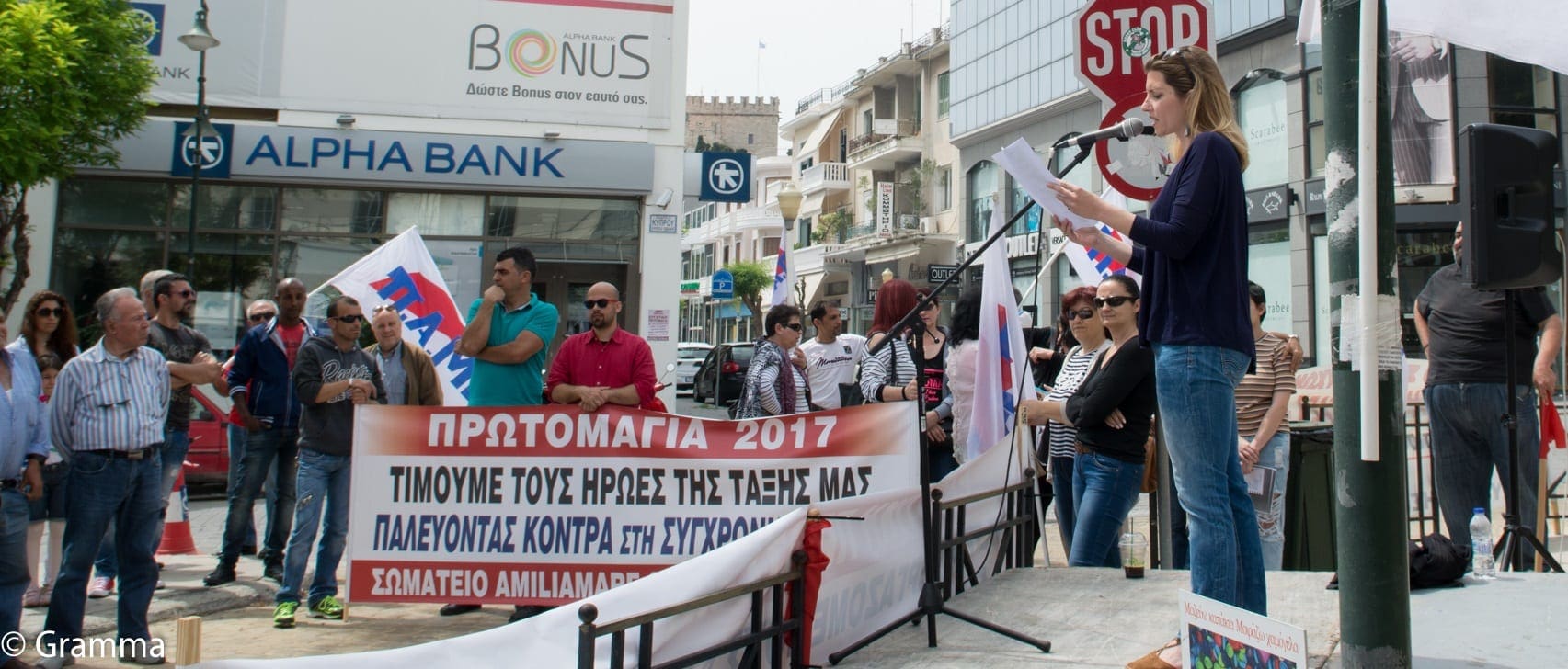 Από νωρίς το πρωί η εξέδρα και οι σημαίες και τα πανό ήταν στημένα στο χώρο ενώ εργατικά τραγούδια ακούγονταν από τη μικροφωνική. Λίγο πριν τις 11 άρχισε να φτάνουν οι εργαζόμενοι. Αρκετοί τουρίστες, ορισμένοι μάλιστα από τη γειτονική Τουρκία, σταματούσαν και φωτογραφίζονταν με τις σημαίες του ΠΑΜΕ.