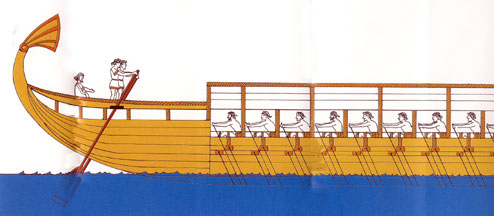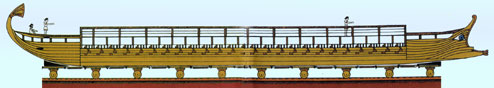 Πλάγια δεξιά όψη “κατάφρακτου” τριήρους με τους ερέτες “εν πλώ”.
