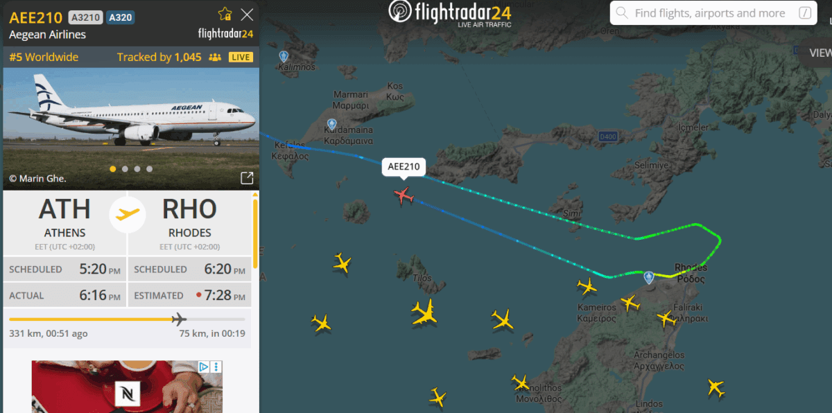 Όπως φαίνεται και από την πορεία της στο σύστημα παρακολούθησης πτήσεων, το αεροσκάφος (πτήση AEE210 / Aegean Airlines) έφτασε στην περιοχή της Ρόδου, πραγματοποίησε κύκλους αναμονής και στη συνέχεια πήρε πορεία απομάκρυνσης, καθώς οι ισχυροί άνεμοι και η κακοκαιρία δυσκόλευαν την ασφαλή προσγείωση στο αεροδρόμιο «Διαγόρας».