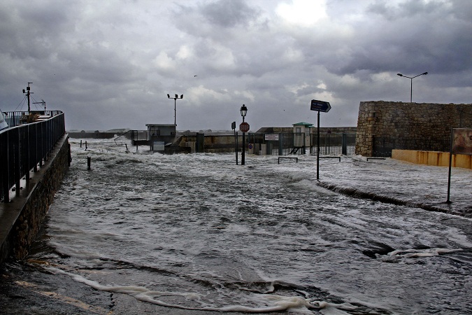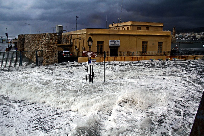 Ενδεικτικές της κατάστασης που επικρατεί στην Κρήτη είναι οι φωτογραφίες από το λιμάνι του Ρεθύμνου. Οι θυελλώδεις άνεμοι που φτάνουν τα 10 μποφόρ είχαν ως αποτέλεσμα η θάλασσα να βγει στη στεριά και να καλυφθούν με νερό το λιμάνι αλλά και οι παρακείμενοι δρόμοι στο Ρέθυμνο.