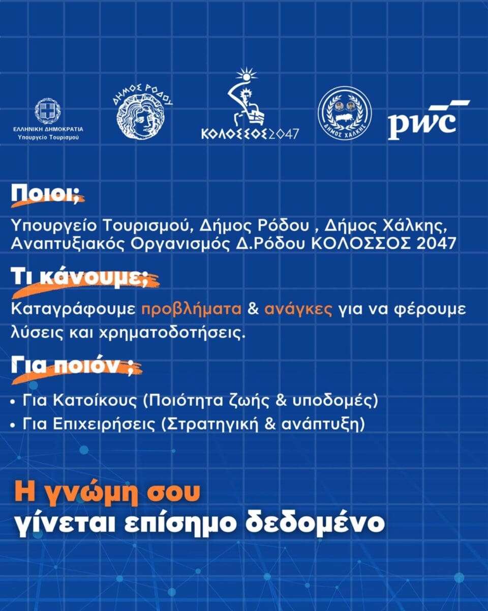 Καλούμε όλους τους κατοίκους και επιχειρηματίες της Ρόδου και της Χάλκης να αφιερώσουν λίγα λεπτά και να συμπληρώσουν τα ερωτηματολόγια, συμβάλλοντας ενεργά στη διαμόρφωση του τουριστικού μέλλοντος της περιοχής.