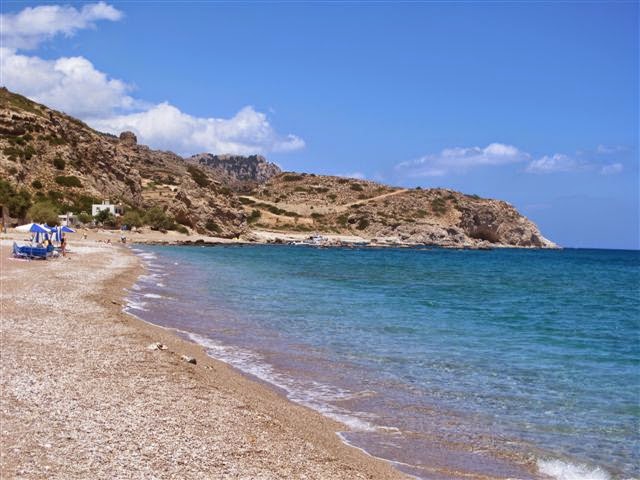 Mια κουκλίστικη πεντακάθαρη παραλία, όχι οργανωμένη, με ξαπλώστρες διαφόρων ειδών, από δερμάτινες, μέχρι απλές, με καμπίνα, με ένα μικρό ντους, με 40 άτομα συνολικά και με τον άνθρωπο που νοίκιαζε τις ξαπλώστρες να ζητάει 6 ευρώ για δερμάτινες ξαπλώστρες, με δώρο ένα μπουκάλι νερό, και με απόδειξη!!!