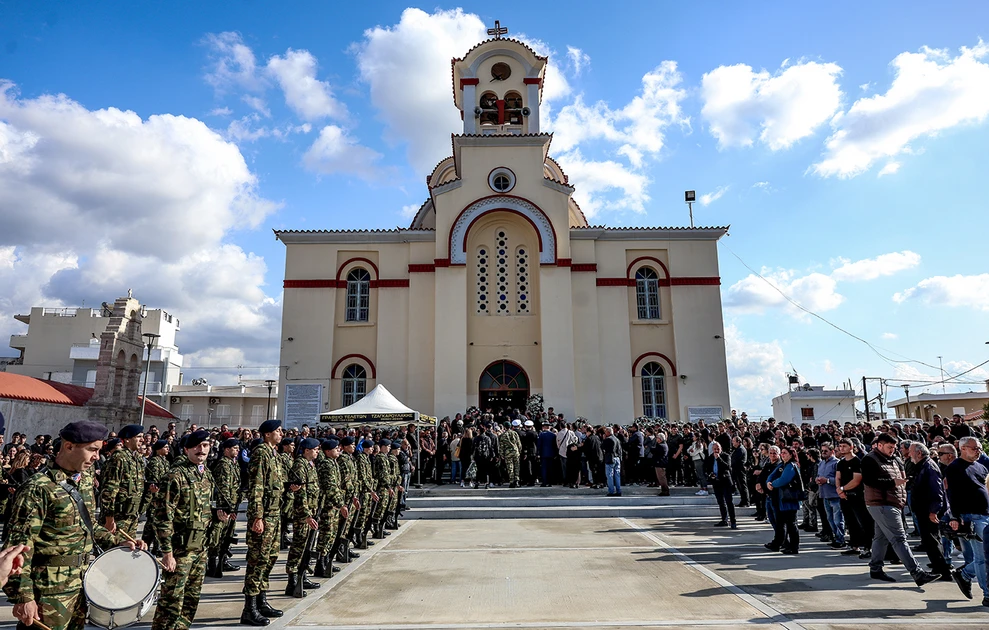 Έξω από τον ιερό ναό του Αγίου Τίτου βρισκόταν στρατιωτικό άγημα για την απόδοση τιμών στον 19χρονο Ραφαήλ.