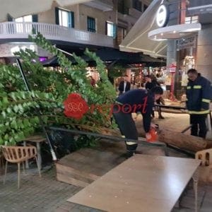 Ένα δέντρο στον πεζόδρομο επι της οδού Θεοδωράκη στο κέντρο της πόλης έπεσε απο τον δυνατό αέρα πάνω σε τραπέζια και καρέκλες καταστήματος εστίασης .